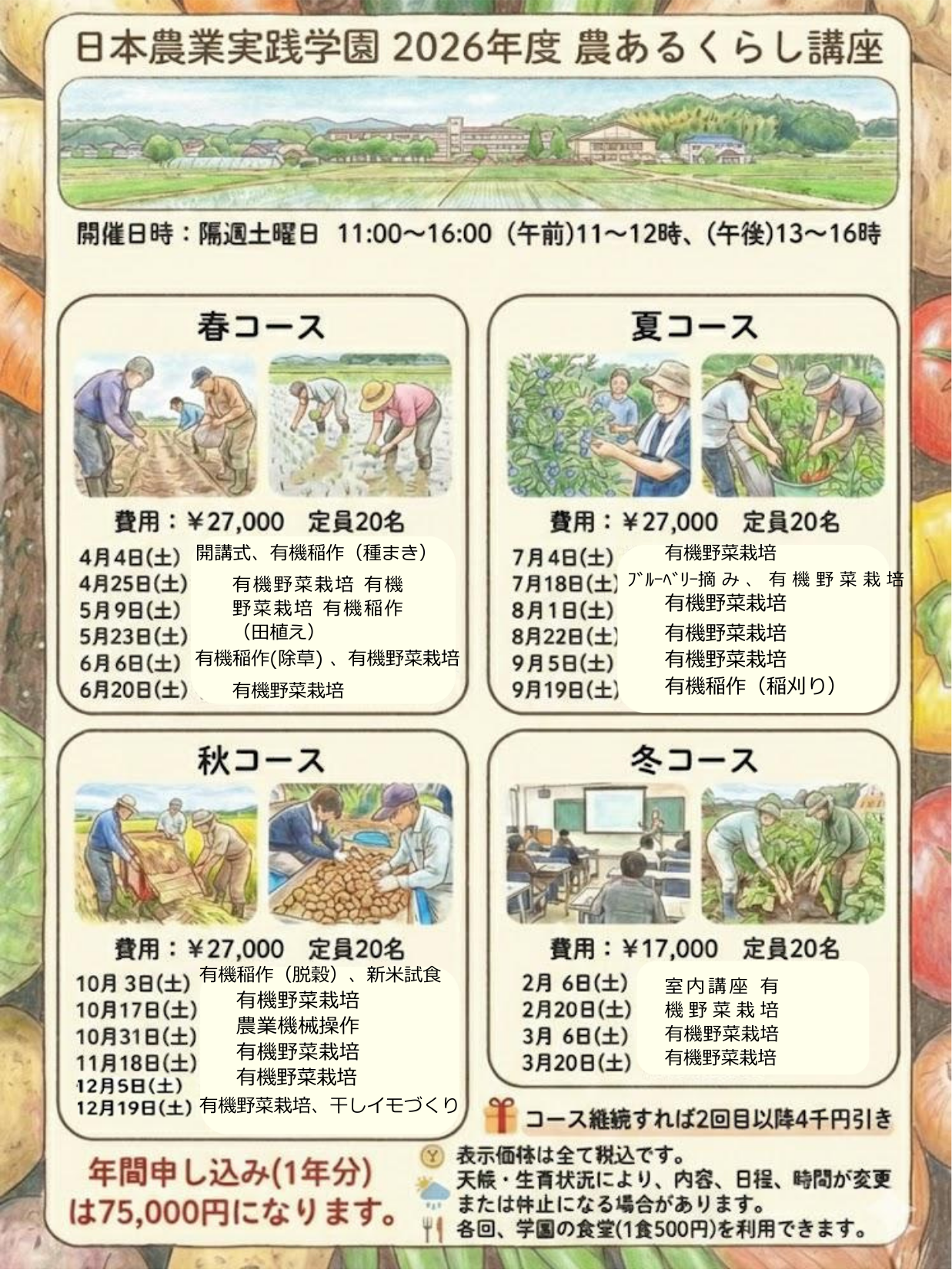 そのような農業初心者のために、週末土曜日を利用して、農場で実践的に勉強していただく講習です。将来農業を志す人だけでなく、農業に関心・興味のある人で、農場実習が可能な方なら誰でも受講できます。
